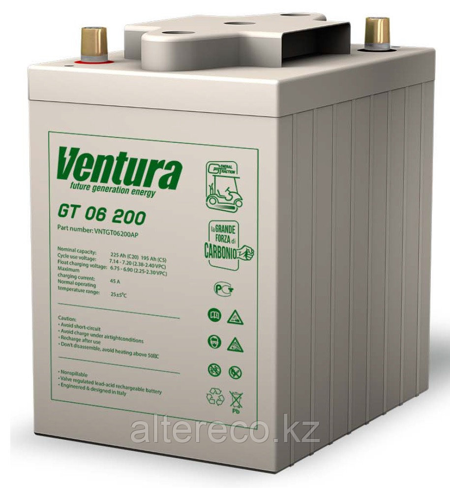 Аккумуляторы Ventura General Traction (GT) являются специализированными необслуживаемыми аккумуляторами, выполненными по технологии VRLA AGM - АКБ с электролитом иммобилизованным в сепараторах из стекловолокна. Cерия GT разработана специально для использования в циклическом режиме работы – в тяговых приложениях. Ventura GT идеально подходит для работы в полоуборочной технике, подъемном оборудовании, электроколясках, электромобилях и гольф-карах, а также в ИБП, где предполагается интенсивное циклирование и прочем подобном. При производстве аккумуляторов Ventura GT используются прочные решётки пластин из свинца высокой чистоты, активная масса повышенной стойкости, созданная по особой технологии, электролит с добавками, уменьшающими его расслоение. Помимо этого, применяются уникальные обратные клапаны и медные выводы высокой проводимости, уменьшающие потери ёмкости при работе и помогающие увеличить энергоотдачу. Всё это находится в ударопрочном корпусе из ABS пластика, с рёбрами жёсткости и удобными ручками для переноски. Каждая батарея находится в индивидуальном коробе из многослойного гофрокартона с пенопластовыми уплотнителями для предотвращения повреждения при транспортировке.